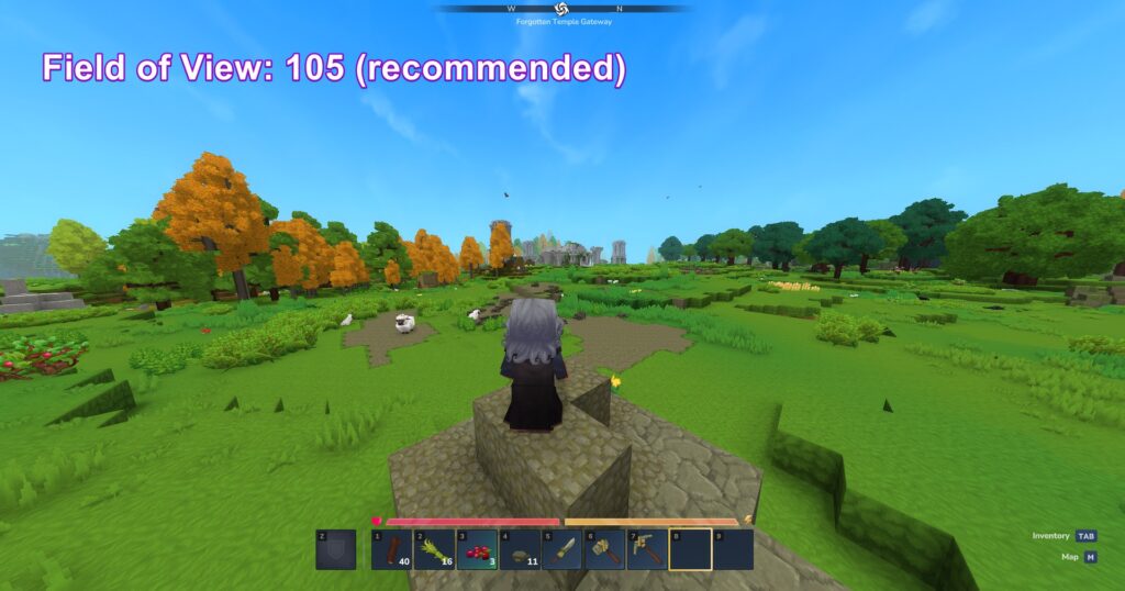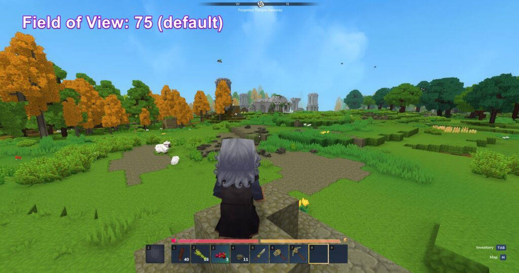 Before you wander too far, there are two settings you might want to adjust. First, increase your field of view from the default setting to somewhere between 100 and 120. The default FOV is pretty restrictive, and bumping it up gives you a much better view of your surroundings, which helps you spot threats or buildings more easily.