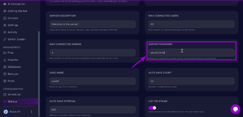 Ensure that your password meets the safety encryption requirements such as using at least 1 Uppercase letter, 1 Special character and be at least 8 character’s long. As this ensures the safety of your V Rising Server.