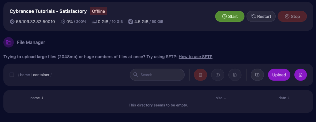 Create a backup of your Satisfactory server before proceeding with the following steps to prevent data loss or world file corruption. This will also allow you to restore your server later if needed.