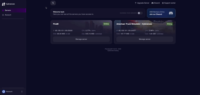 You will be taken back to the login page where you can now log in with your new set of credentials. Once logged in, you will be presented with the Cybrancee Pterodactyl Control Panel. This is where you will manage and configure your game server. From here, select the ‘Manage Server’ button.